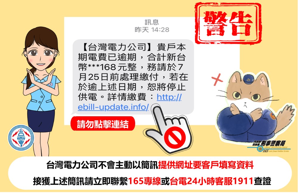 並立即向165反詐騙諮詢專線或台電公司24小時客服專線1911詢問,以避免遭受詐騙~