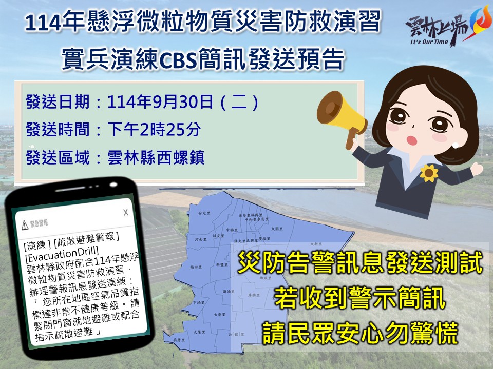 為辦理「114年懸浮微粒物質災害防救演習」,雲林縣將於 9月30日(星期二)下午2時25分,針對雲林縣 西螺鎮 發布「疏散避難警報」災防告警訊息。屆時,位於上述區域的民眾4G及5G手機將會收到相關測試訊息。此訊息為本次演習測試所發送,相關區域並無懸浮微粒物質災害情況,請民眾安心,勿驚慌。