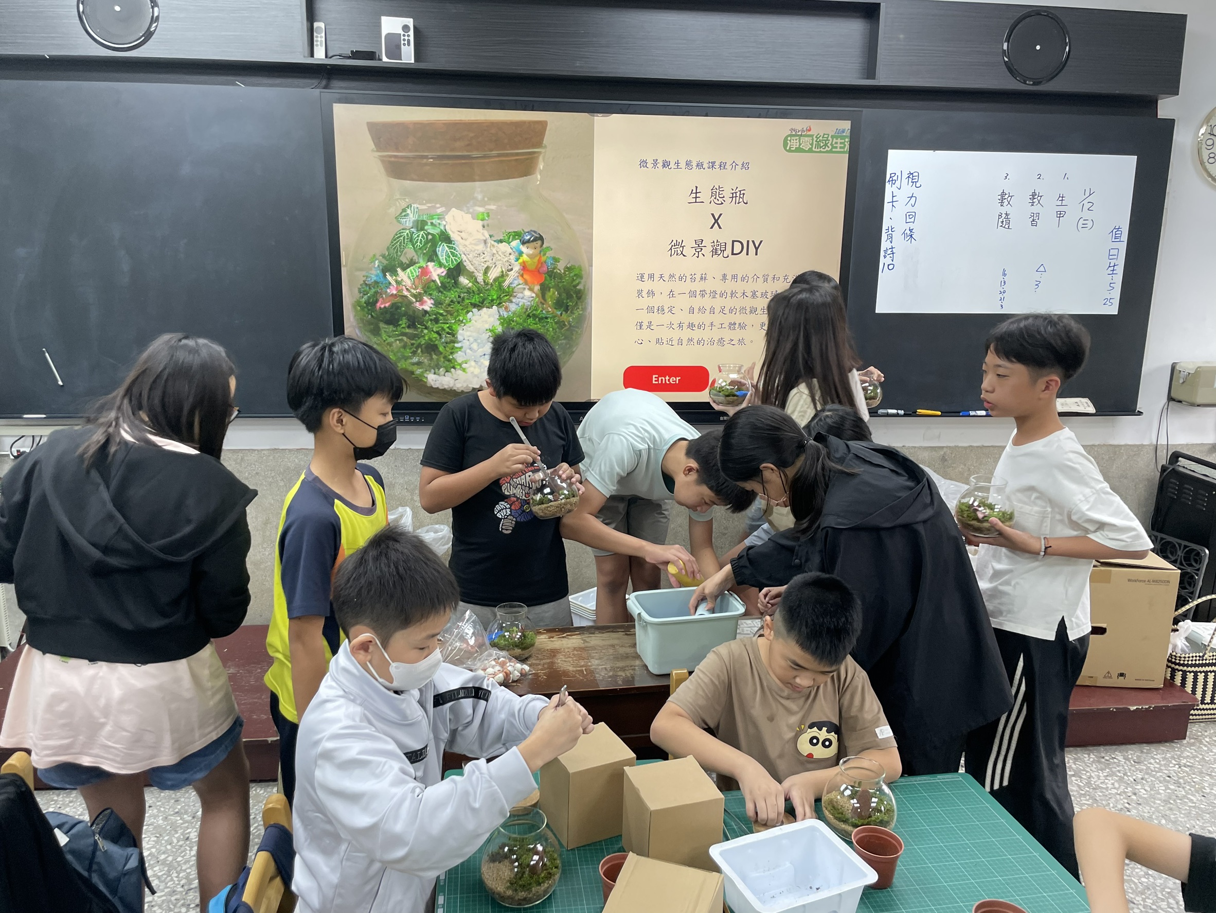 課程中由專業講師以淺顯易懂的方式介紹生態瓶內的水循環、光合作用與微生物作用原理,並指導學生運用土壤、苔蘚、植栽及小型裝飾素材,製作出兼具教育意涵與美感的微景觀作品,同時鼓勵使用回收再製玻璃容器,實踐資源循環利用的理念。現場氣氛熱烈,親手創作的過程不僅有趣,也讓他們更懂得珍惜自然、愛護環境。