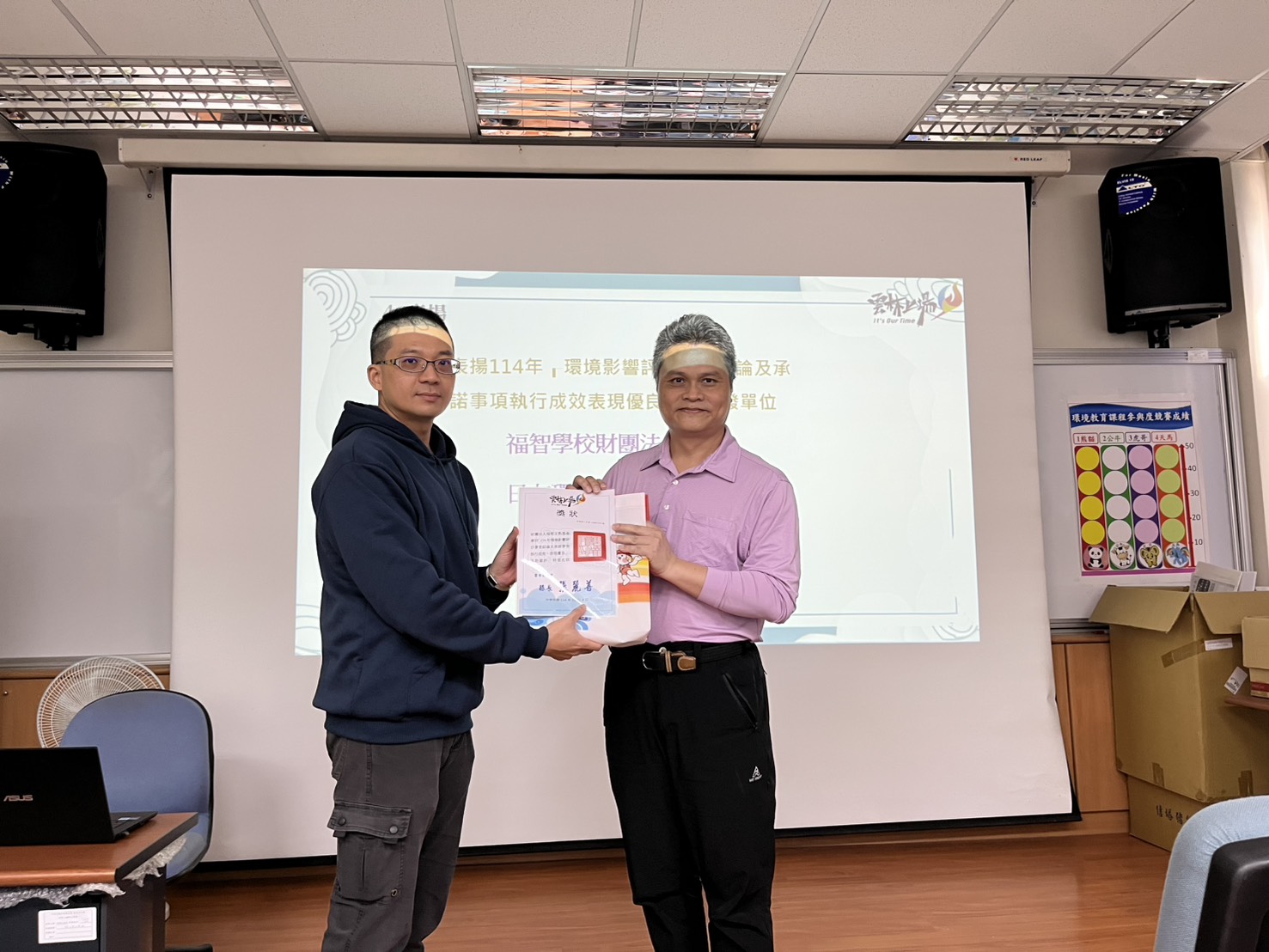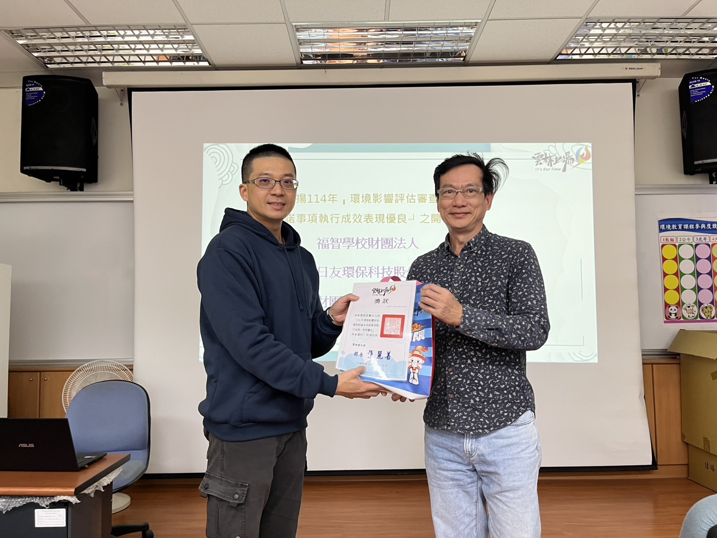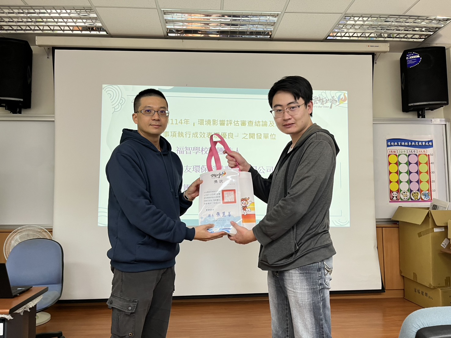 為促使本縣列管之開發單位確實執行環境影響評估審查結論及承諾事項,環保局持續辦理現場查核同時進行「環境影響評估監督評分表」評定績效,截至114年度環境影響評估監督案計33件 ,其中表現優異之前3名,分別為:福智學校財團法人、日友環保科技股份有限公司、財團法人福智文教基金會,於會中公開頒贈獎狀及禮品,以茲鼓勵。